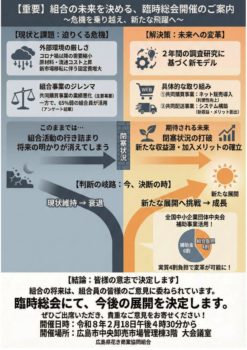広島県花き商業協同組合では、昨年度に続き、令和7年度も全国中小企業団体中央会の課題対応支援事業の補助金を受けて、昨年度のビジョン策定を踏まえて共同購買事業のネット化導入、共同配送事業実現に向けて要件定義などを行いました。