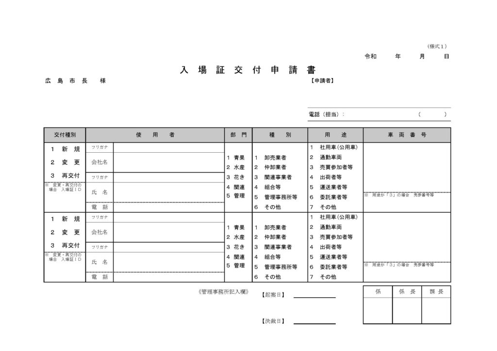 来年(2026年)4月1日以降の中央卸売市場への入場証の更新および新規の申請につきまして、1月16日(金)までに様式1「令和8年度入場証交付申請書」にご記入いただき、組合事務局までFAX(082-279-2620)かメール(kakisyo@nifty.com)でお送りください。