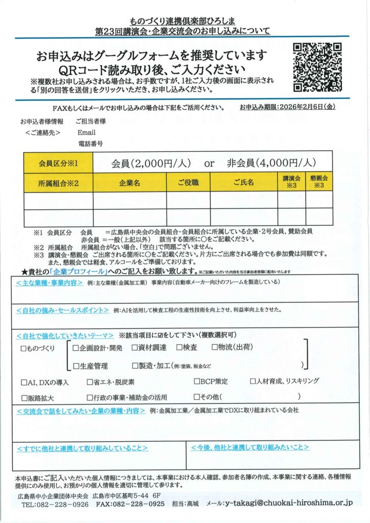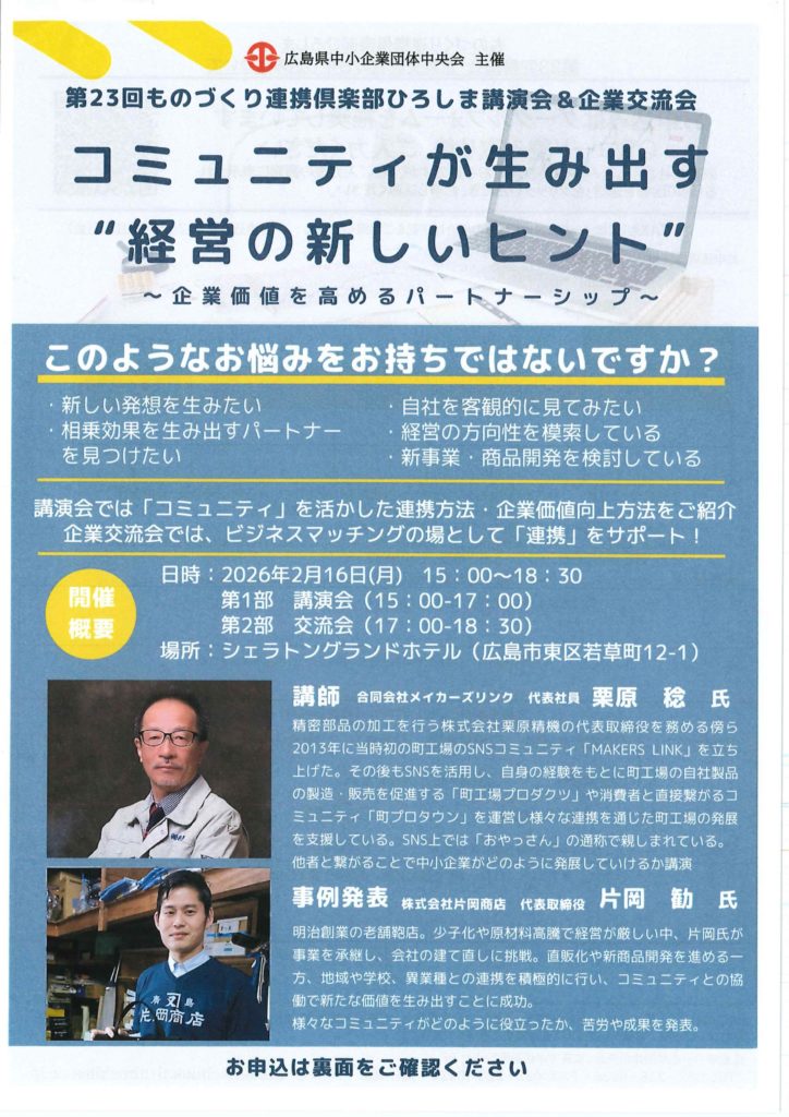 広島県中小企業団体中央会では、来る2月16日(月)午後3時から午後5時まで
