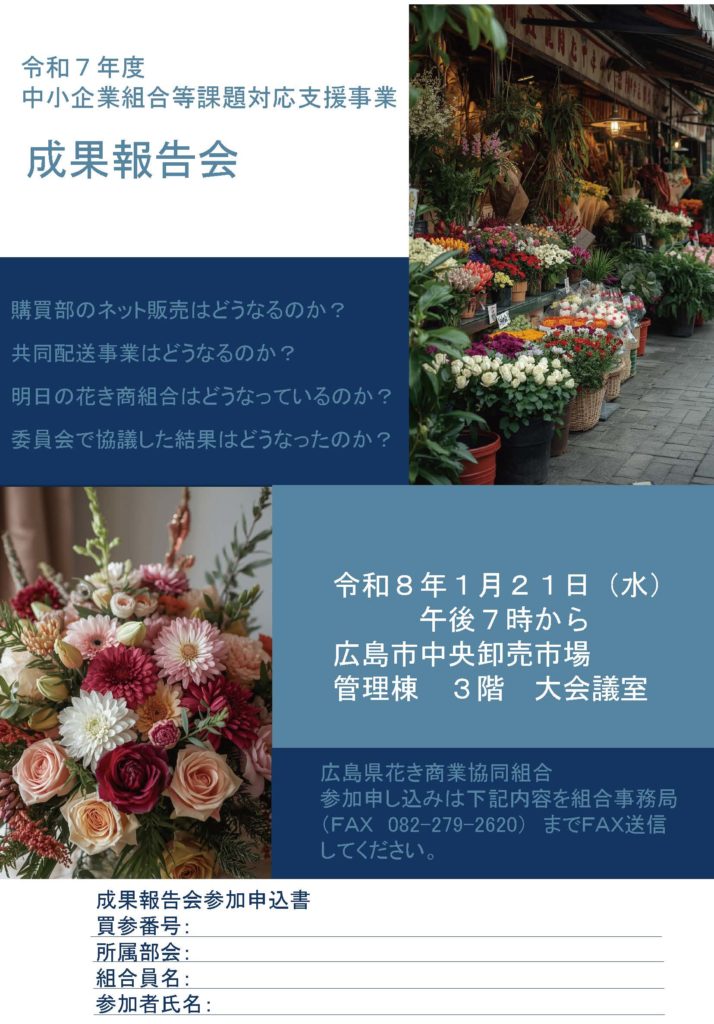 広島県花き商業協同組合では、昨年度に続き、令和7年度も全国中小企業団体中央会の課題対応支援事業の補助金を受けて、昨年度のビジョン策定を踏まえて共同購買事業のネット化導入、共同配送事業実現に向けて要件定義などを行いました。